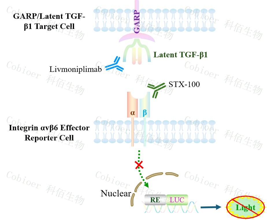 GARP/Latent TGF-β1 Target Cell 作為 Integrin αvβ6 Effector Reporter Cell 的靶細(xì)胞,藥 靶模型很好的模擬了體內(nèi) Integrin&GARP/Latent TGF-β1 的信號(hào)轉(zhuǎn)導(dǎo)過(guò)程,原理見(jiàn)下圖所示。![]() Figure 1. GARP/Latent TGF-β1 Target Cell 細(xì)胞模型圖 |