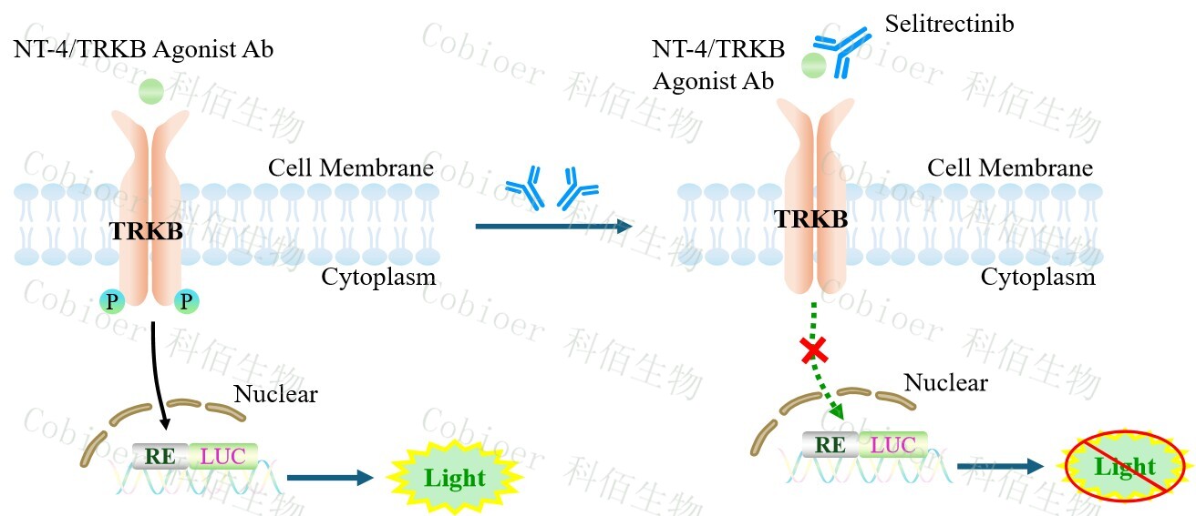 TRKB Effector Reporter Cell 報(bào)告基因藥靶模型很好的模擬了體內(nèi) TRKB 的信號(hào)轉(zhuǎn)導(dǎo)過(guò)程,原理見(jiàn)下圖所示。![]() Figure 1. TRKB Effector Reporter Cell 模型原理圖 |