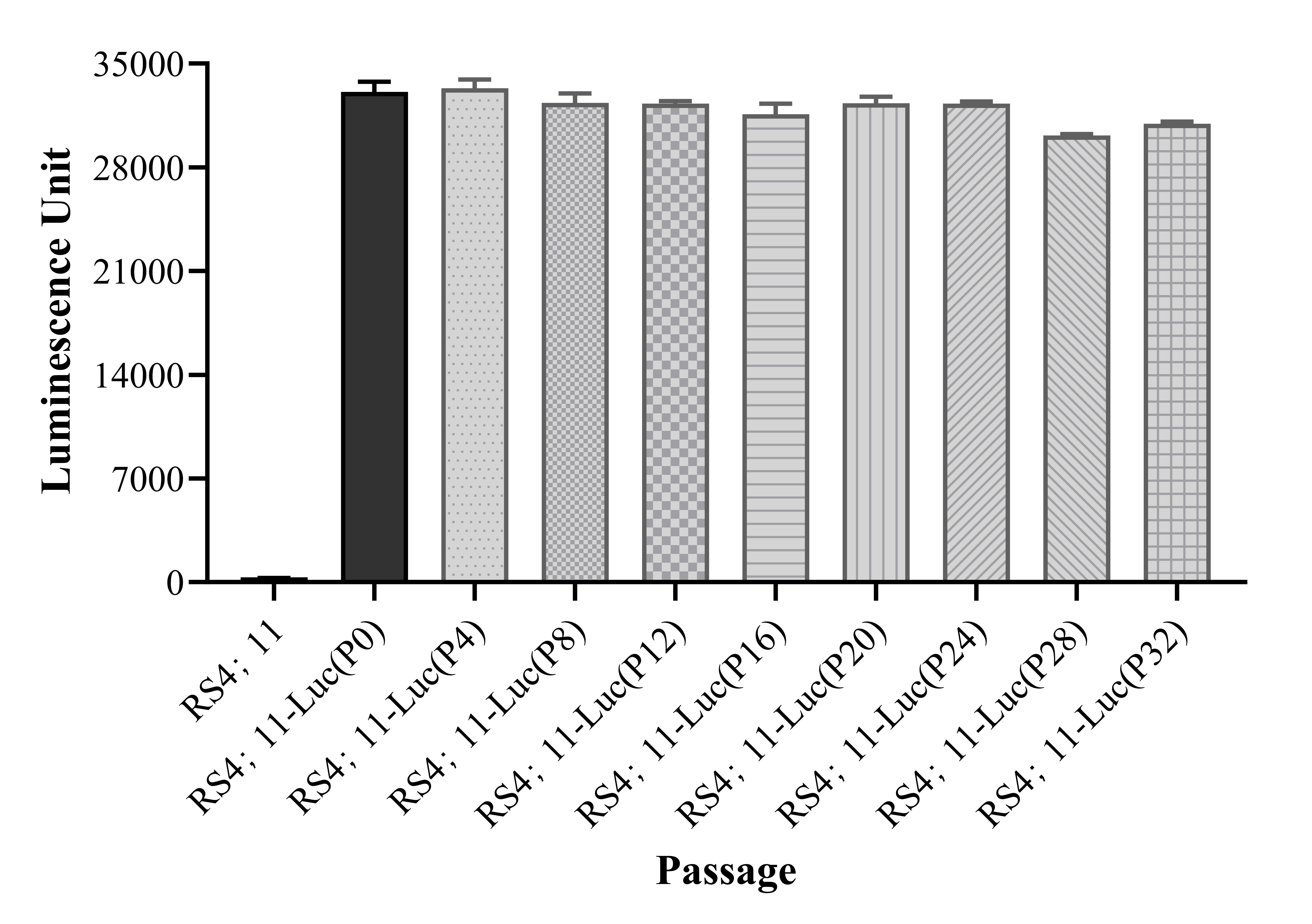 Figure 1. Stablity test results. RS4;11-Luc showed at least 32 passage stability with similar luminescence unit.