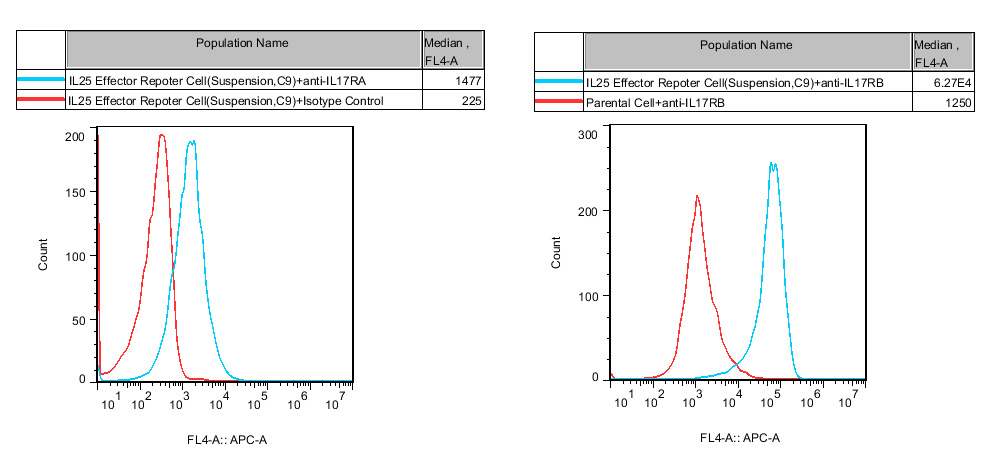 ![]() Figure 4. Inhibition of Human IL25-induced Reporter Activity by IL25 Neutralization Ab or IL17RA&RB Blocking Abs in IL25 Effector Reporter Cell (Suspension, C9). |