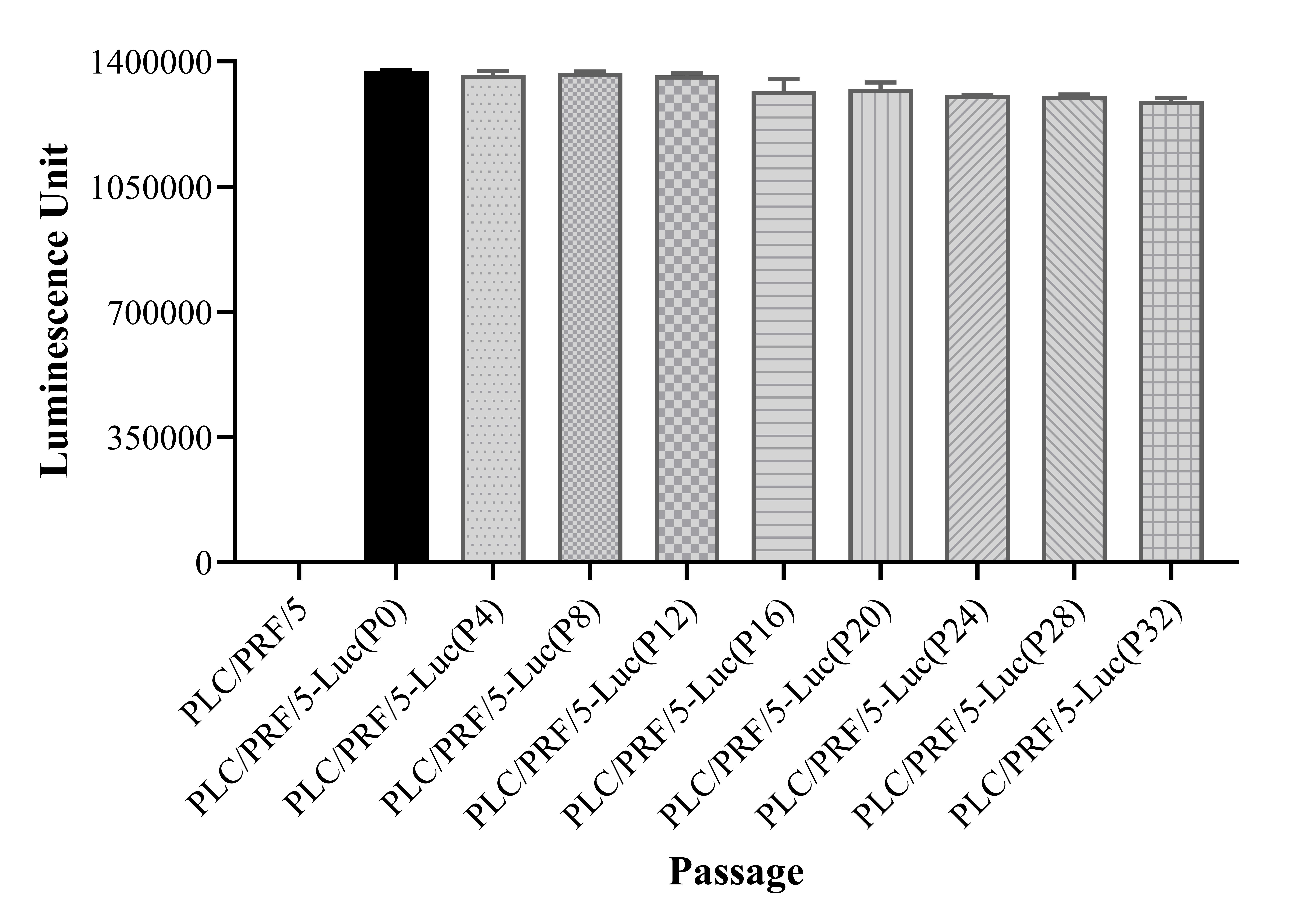 Figure 1. Stablity test results. PLC/PRF/5-Luc showed at least 32 passage stability with similar luminescence unit. |