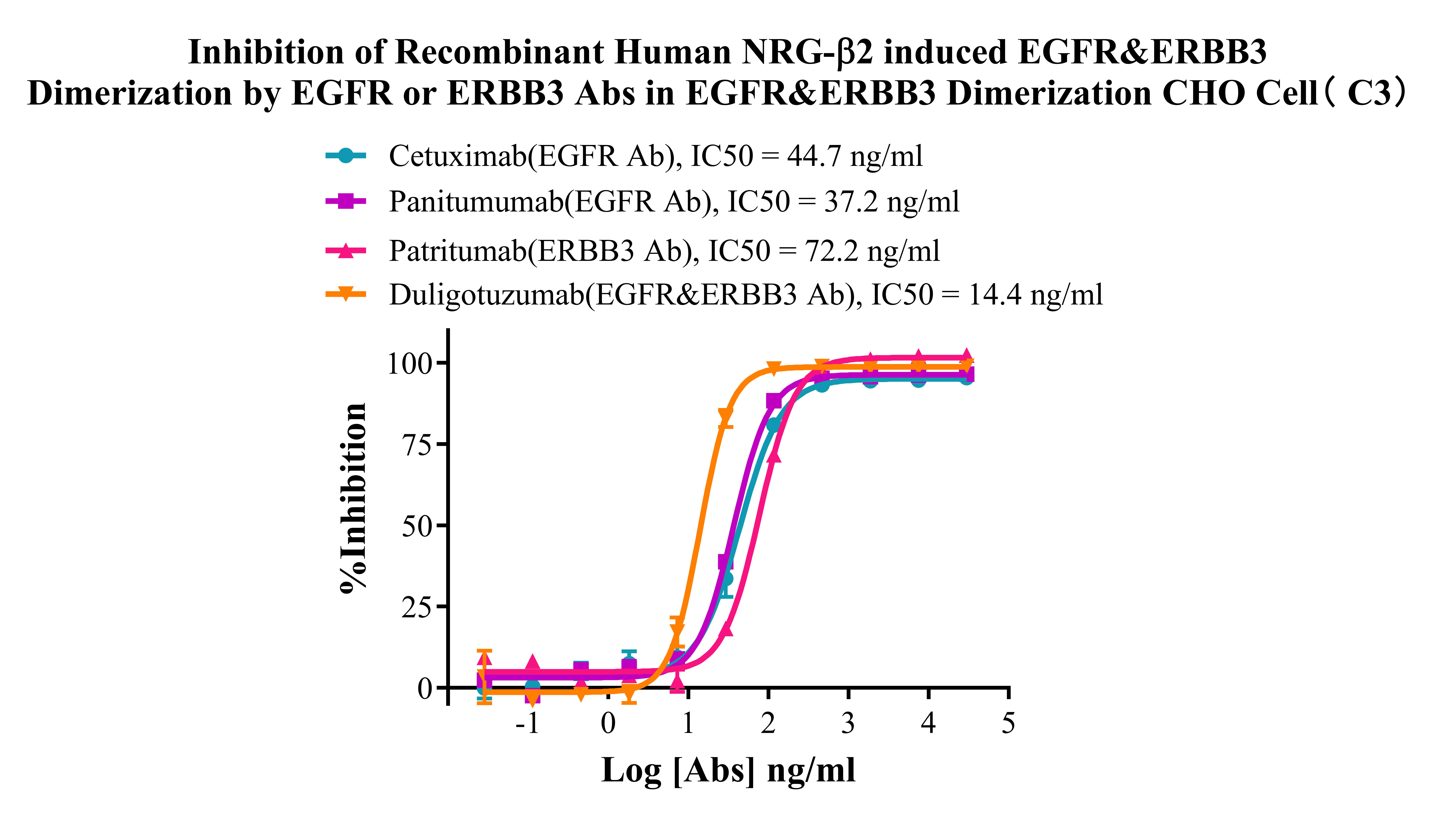 ![]() Figure 2. Inhibition of Recombinant Human NRG-β1 induced EGFR&ERBB3 Dimerization by EGFR or ERBB3 Abs in EGFR&ERBB3 Dimerization CHO Cell(C3). ![]() |