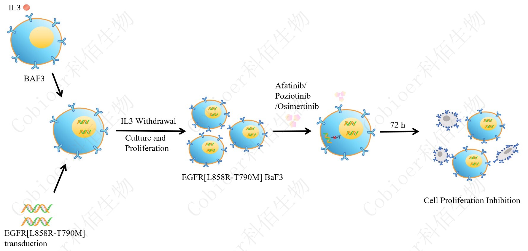 BaF3(小鼠原 B 細(xì)胞)的生長和增殖需要 IL-3 的維持。通過引入各種表達(dá)激酶的基因, 能作為 BaF3 的驅(qū)動基因,讓 BaF3 不再依賴 IL-3 而增殖,進(jìn)而激酶基因成為 BaF3 增殖依 賴的驅(qū)動基因,用于評估小分子藥物對激酶的靶向抑制作用,原理及流程見下圖所示。