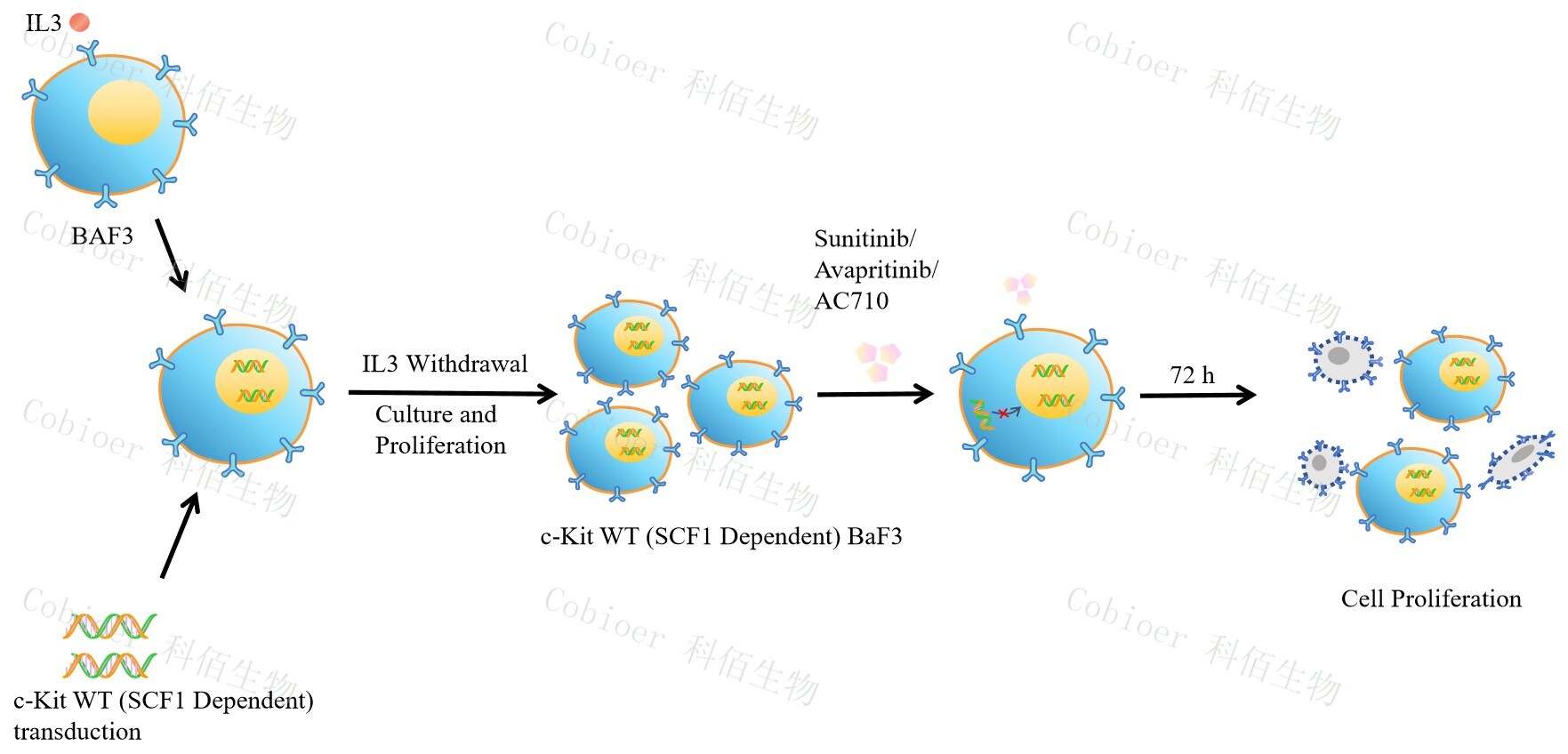 c-Kit WT (SCF1 Dependent) BaF3 藥靶細(xì)胞,通過轉(zhuǎn)導(dǎo)融合狀態(tài)的 c-Kit WT (SCF1 Dependent) 基因到 BaF3 細(xì)胞系中,穩(wěn)定表達(dá)人融合形態(tài)下的 c-Kit WT (SCF1 Dependent) 基因。