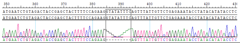 Fig 2. RNA的sanger測序發(fā)生14外顯子的缺失