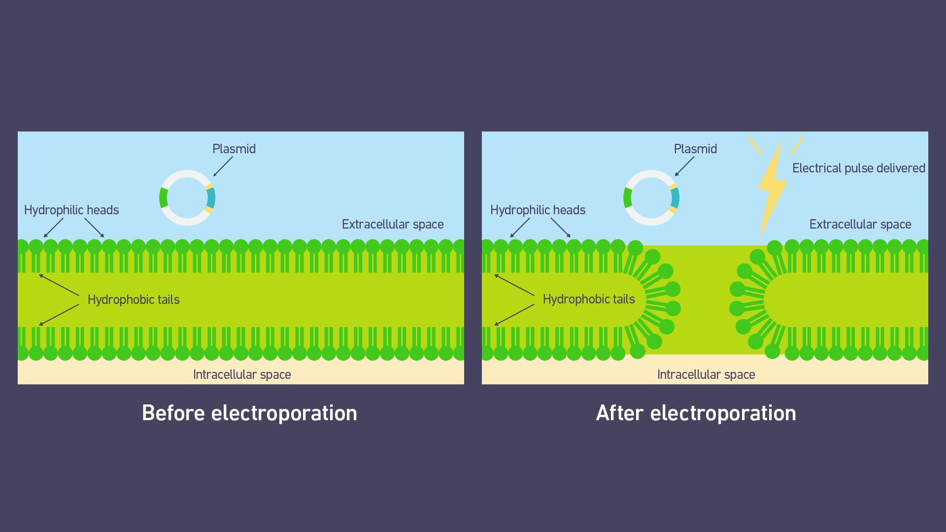 電脈沖擾亂細(xì)胞膜的磷脂雙層,從而形成孔隙(圖 2)。這種過(guò)程是不對(duì)稱的,孔隙首先在細(xì)胞的陽(yáng)極側(cè)形成。同時(shí),跨膜電位增加。這驅(qū)使帶電分子(例如質(zhì)粒DNA)首先吸附到細(xì)胞陰極側(cè)的膜上,然后穿過(guò)這些孔隙進(jìn)入細(xì)胞 (圖 3)。