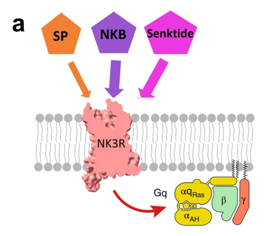 速激肽是在整個(gè)神經(jīng)和免疫系統(tǒng)中表達(dá)的神經(jīng)肽,作為興奮性神經(jīng)遞質(zhì),它們?cè)谡{(diào)節(jié)各種生理功能中很重要。在不同的速激肽中,P物質(zhì)(SP)、神經(jīng)激肽A(NKA) 和NKB已得到充分研究。這些肽可以通過三種不同的G蛋白偶聯(lián)受體(GPCR)、神經(jīng)激肽1受體 (NK1R)、神經(jīng)激肽2受體(NK2R)和NK3R發(fā)揮作用,作為具有不同親和力的完全激動(dòng)劑。NKB、SP和NKA是10-11個(gè)氨基酸的線性肽,它們共享一個(gè)保守的C端基序-Phe-Xaa-Gly-Leu-Met-NH2,介導(dǎo)神經(jīng)激肽受體激活,而速激肽神經(jīng)肽的不同N末端與神經(jīng)激肽受體的優(yōu)先結(jié)合。NKB優(yōu)先激活與G蛋白Gαq偶聯(lián)的NK3R進(jìn)行細(xì)胞內(nèi)信號(hào)轉(zhuǎn)導(dǎo),而 SP和NKA分別優(yōu)先與NK1R和NK2R結(jié)合。SP還可以激活NK3R,但活性低于NKB 。SP 類似物Senktide是一種六肽,在6位有 Asp,在8位有甲基化Phe,N端受琥珀酸保護(hù)。此外,Senktide比內(nèi)源性配體NKB和SP更有效地激活 NK3R。