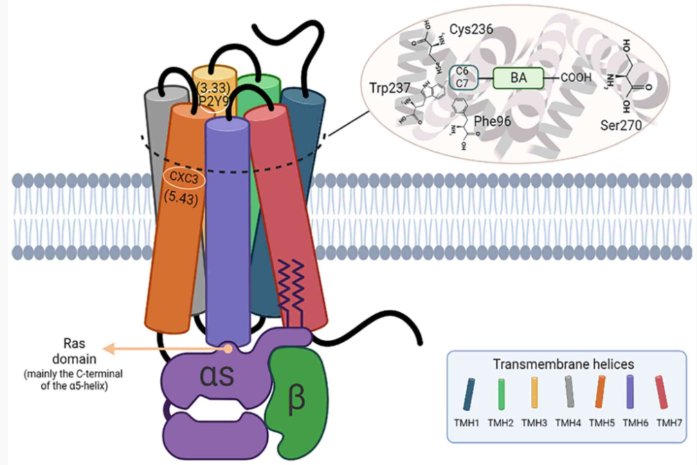 TGR5 受體是第一個(gè)已知的膽汁酸特異性G蛋白偶聯(lián)受體,也被稱(chēng)為膽汁酸受體 1(GPBAR1),屬于 A 類(lèi) G 蛋白偶聯(lián)受體(GPCR)亞家族。該受體由七個(gè)跨膜螺旋(TMH1-7)、三個(gè)胞外環(huán)(ECL1-3)組成,有助于配體結(jié)合,以及三個(gè)胞內(nèi)環(huán)(ICL1-3),參與將信號(hào)傳遞給下游信號(hào)分子。