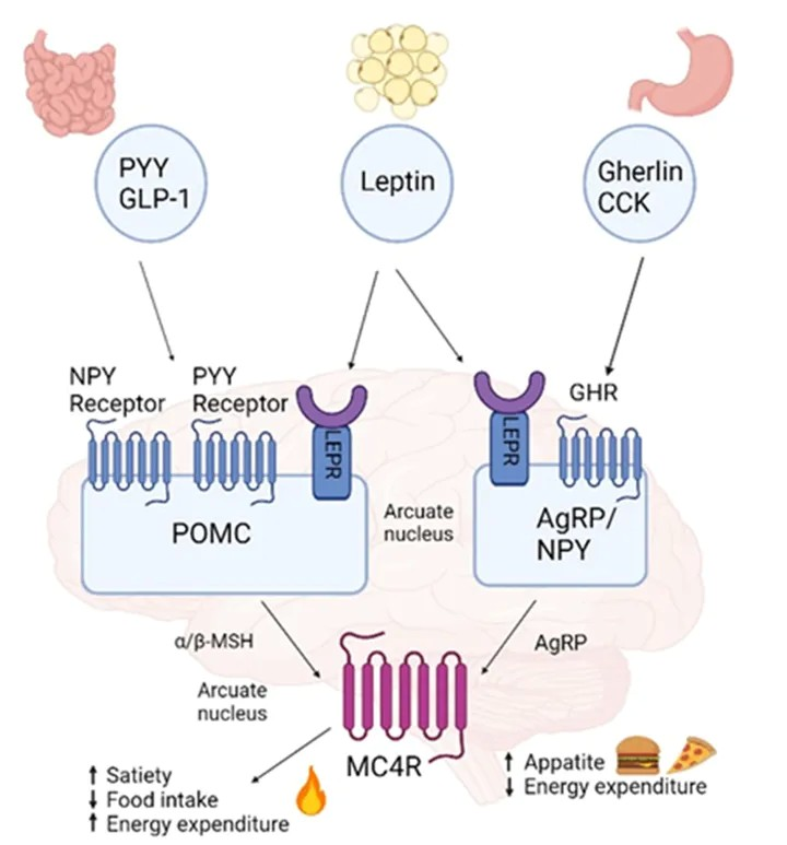 MC4R (黑皮質(zhì)素4受體) 是黑皮質(zhì)素受體家族成員之一,其家族屬于視紫紅質(zhì)樣A類GPCR,成員還包括:MC1R、MC2R、MC3R和MC5R。黑皮質(zhì)素受體 (MC1R-MC5R) 位于多種細(xì)胞類型上,并遍布大多數(shù)身體系統(tǒng)。MC4R是中樞黑皮質(zhì)素系統(tǒng)的重要組成部分,主要在下丘腦室旁核(PVH)中表達(dá),是一種A類GPCR。在高能量平衡狀態(tài)下,阿片黑皮質(zhì)素原 (POMC) 神經(jīng)元釋放多肽MC4R激動(dòng)劑-α-黑素細(xì)胞刺激激素(α-MSH)。α- MSH與MC4R結(jié)合會(huì)激活MC4R信號(hào)傳導(dǎo),抑制食欲和食物攝入。在低能量平衡狀態(tài)下,下丘腦室旁核中釋放AgRP (agouti-related peptide)。AgRP作為MC4R與α- MSH結(jié)合的競(jìng)爭(zhēng)性拮抗劑,也是MC4R反向激動(dòng)劑,抑制MC4R信號(hào)傳導(dǎo)。