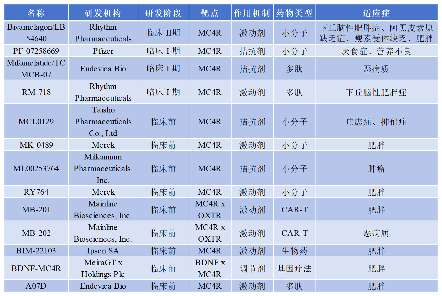 除去臨床階段終止及無(wú)進(jìn)展的幾款藥物,目前共有多款處于臨床及臨床前的靶向MC4R的藥物,既有小分子藥物也有多肽類藥物。部分信息如下: