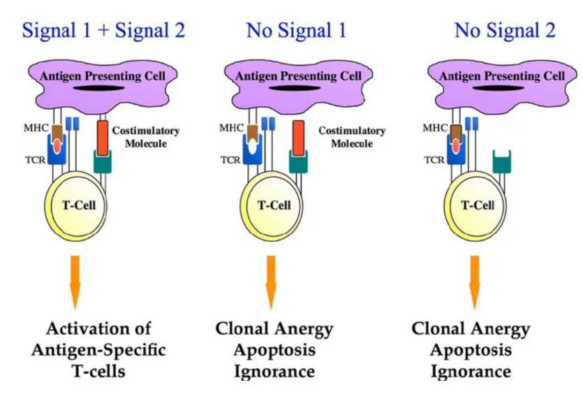 但僅有信號1無法有效激活T細胞的免疫反應,還需要足夠的共刺激信號(信號2)。信號2不是抗原特異性的,而是通過抗原呈遞細胞上表達的共刺激信號分子和T細胞的相互作用而實現的。共刺激信號對于T細胞的增殖,分化和存活是必要的。如果沒有共刺激信號,可能會出現T細胞無應答/應答低下,細胞死亡或者會有免疫耐受的情況。