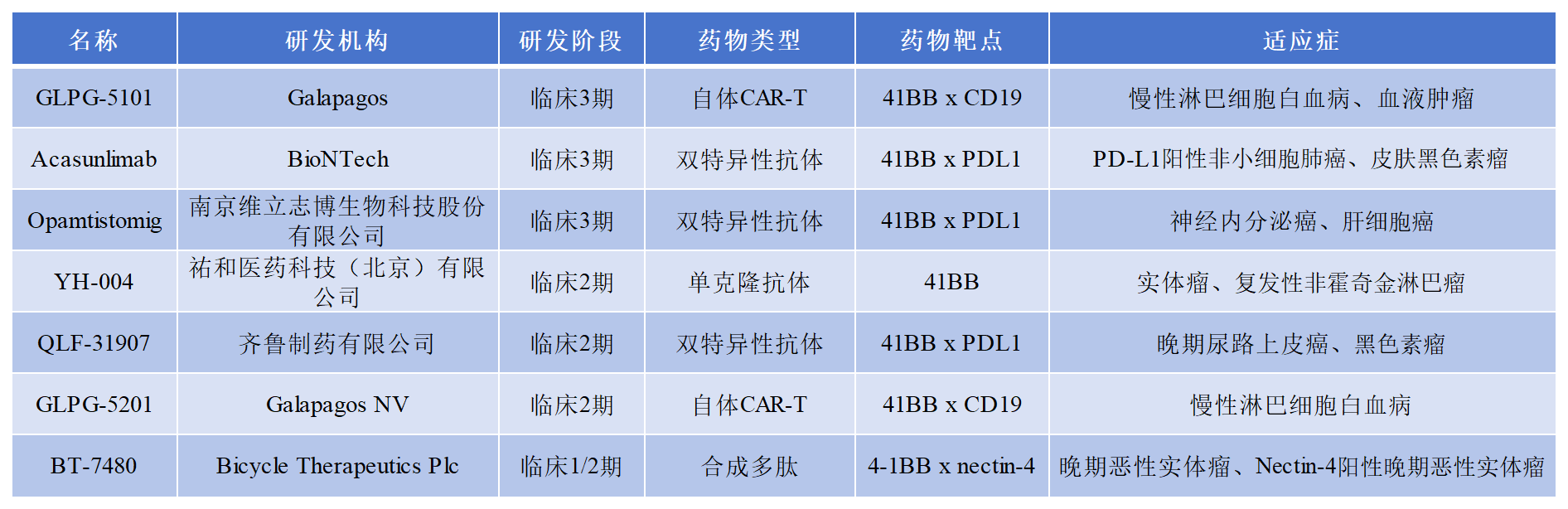 關于4-1BB第一代藥物研發(fā)主要聚焦于4-1BB激動型抗體類藥物:2005年百時美施貴寶(BMS)公司首次開發(fā)的抗體藥物urelumab (BMS-663513),但后續(xù)由于肝毒性的不良事件而終止開發(fā);第二款4-1BB的抗體藥物是由輝瑞開發(fā)的utomilumab (PF-05082566),于2011年進入臨床試驗,但是它的療效很有限,最終也停止在臨床開發(fā)。第二代4-1BB激動型藥物主要分為兩大類:IgG類型(單抗結構)以及雙/多抗的4-1BB激動型藥物。