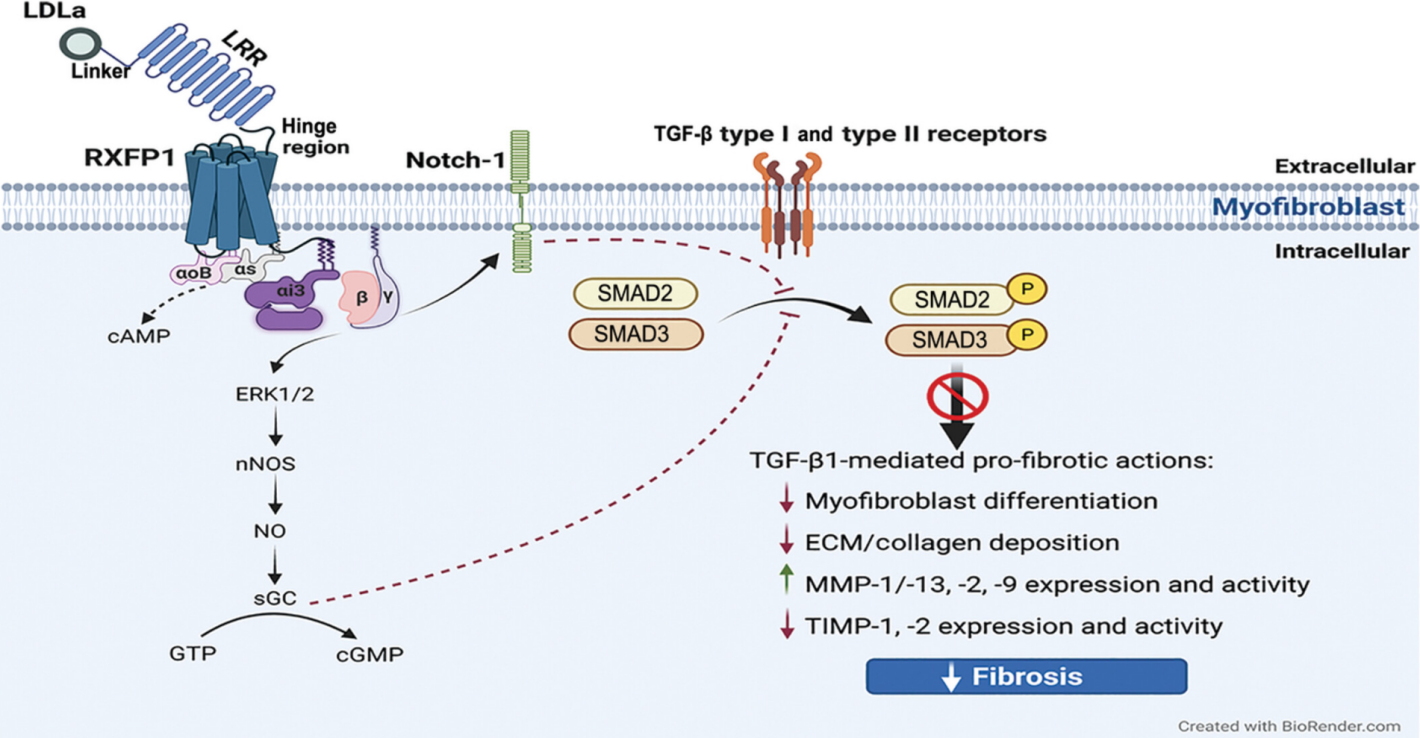 RXFP1 是一種 C 型 LGR 相關 GPCR,含有由多個細胞外基序組成的約 400 個氨基酸的大細胞外區(qū)域,包括富含亮氨酸的重復結構域(LRR)和低密度脂蛋白 A 類 (LDLa) 模塊,它們通過連接子區(qū)域連接。RXFP1在其 LRR 相關胞外結構域內(nèi)激活,引發(fā)受體的構象變化,然后允許其 7TM 結構域的細胞外環(huán)內(nèi)低親和力結合位點的相互作用和激活,這由其連接子區(qū)域促進。受體的連接子區(qū)域在配體結合時穩(wěn)定受體構象方面起著關鍵作用,并將殘基定位在連接子區(qū)域和 LDLa 模塊內(nèi)以與 7TM 結構域結合并激活受體。然后,該作用使 LDLa 模塊能夠充當系留激動劑,并在配體結合時引導受體信號傳導。位于 RXFP1 C 末端的鉸鏈區(qū)域在受體激活時也會發(fā)生構象和增加暴露,以誘導 G 蛋白 (Gαs, GαOB, Gαi3和 Gβγ) 活動。在肌成纖維細胞中,這導致 cAMP 短暫升高,但 pERK1/2 增加更持久,nNOS-NO-sGC-cGMP 活性因 RXFP1-ERK1/2 依賴性增加。RXFP1-pERK1/2-nNOS-NO-sGC-cGMP 依賴性途徑的激活或肌成纖維細胞直接激活 cGMP 然后抑制 SMAD2 和 SMAD3 水平的 TGF-β1 信號轉導,從而抑制 TGF-β1 促進肌成纖維細胞分化和肌成纖維細胞誘導的 ECM/膠原蛋白合成和沉積的能力。RXFP1 激活還可以調(diào)節(jié) Notch-1 依賴性信號傳導,以抑制肌成纖維細胞中的 TGF-β1/SMAD3 軸。此外,RXFP1-pERK1/2-nNOS-NO-sGC-cGMP依賴性途徑的激活導致ECM降解MMP的表達和活性增加(當TGF-β1活性上調(diào)時通常受到抑制),以及TIMP的活性降低,這將促進MMP誘導的已建立ECM/膠原沉積的分解,并有助于減少纖維化進展。