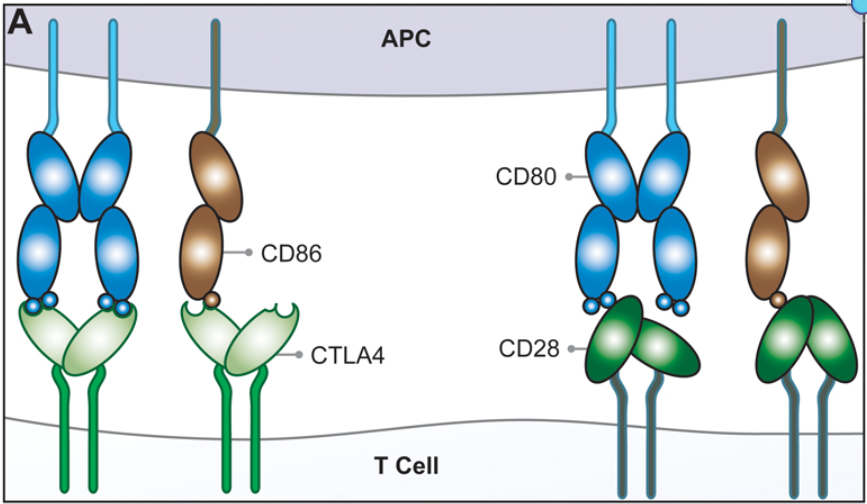 細(xì)胞毒性T淋巴細(xì)胞相關(guān)蛋白4(cytotoxic T-lymphocyte-associated protein 4,CTLA4)也稱為CD152(分化簇 152),是一種蛋白受體,其作為免疫檢查點起作用并下調(diào)免疫應(yīng)答。CTLA4在調(diào)節(jié)性T細(xì)胞中組成型表達,但在活化后僅在常規(guī)T細(xì)胞中上調(diào),這種現(xiàn)象在癌癥中特別顯著。 當(dāng)與抗原呈遞細(xì)胞表面上的CD80或CD86結(jié)合時,它起到“關(guān)閉”開關(guān)的作用。由于T細(xì)胞需要T細(xì)胞受體(TCR)激活和CD28共激活才能成為效應(yīng)T細(xì)胞,CTLA-4通過與CD28競爭共刺激配體CD80和CD86來負(fù)向調(diào)控該過程。其他的免疫檢查點如PD-1與其配體PD-L1和PD-L2結(jié)合,可以傳遞抑制TCR信號的信號。CTLA-4和PD-1的這些效應(yīng)可能迫使殺癌T細(xì)胞退縮進入休眠或疲勞的非活躍狀態(tài)。