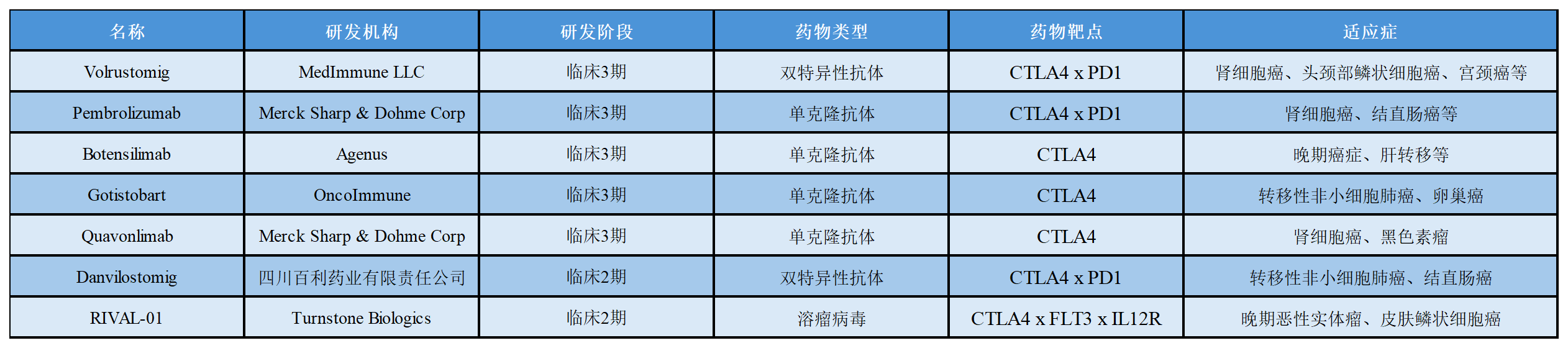 關(guān)于CTLA4在研的部分藥物進展如下表所示: