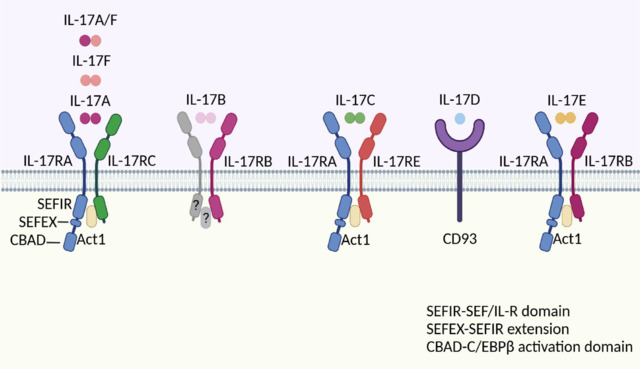 IL-17 細(xì)胞因子具有一個(gè)半胱氨酸環(huán)結(jié)構(gòu),它們會(huì)與特定的 IL-17R 受體結(jié)合,通過 SEFIR、SEFEX 和 CBAD 結(jié)構(gòu)域激活免疫信號(hào)傳導(dǎo)。IL-17 信號(hào)傳導(dǎo)始于 IL-17A/A、IL-17A/F 或 IL-17F/F 細(xì)胞因子與其受體(IL-17RA 和 IL-17RC)的結(jié)合,或者 IL-17E/E 細(xì)胞因子與其受體(IL-17RA 和 IL-17RB)的結(jié)合。當(dāng)配體結(jié)合后,Act1 會(huì)激活多種獨(dú)立的信號(hào)傳導(dǎo)途徑,這些途徑通過不同的 TRAF 蛋白介導(dǎo)。TRAF6 的激活會(huì)導(dǎo)致 NF-κB、C/EBPβ、C/EBPδ 和 MAPK 信號(hào)通路的觸發(fā)。IL-17R-Act1 復(fù)合物還通過 TRAF4 與 MEKK3 和 MEK5 結(jié)合,從而激活 ERK5。不同類別的抑制劑,如泛素酶(TRAF3)、去泛素酶(A20)、RBP(HuR、ACT1、Aridα 和 DDX3X)、內(nèi)切核糖核酸酶(MCPIP1/Regnase-1)和微小 RNA(miR-23b),通過各種獨(dú)立的機(jī)制負(fù)向調(diào)節(jié) IL-17 信號(hào)傳導(dǎo)。IL-17C 主要由上皮細(xì)胞表達(dá)。當(dāng) IL-17RA/RE 受體復(fù)合物表達(dá)時(shí),上皮細(xì)胞本身和 TH17 細(xì)胞都是 IL-17C 的作用靶點(diǎn)。除了增加 Th17 細(xì)胞中 IL17A 的表達(dá)外,IL-17C 還通過間接方式增強(qiáng)吸引中性粒細(xì)胞的趨化因子在上皮細(xì)胞中的表達(dá),最終導(dǎo)致強(qiáng)烈的炎癥反應(yīng)。