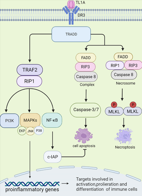 在靜息的T細(xì)胞中,DR3以可溶性形式表達(dá),保護(hù)細(xì)胞免于凋亡。活化的T細(xì)胞表達(dá)跨膜DR3。sTL1A結(jié)合DR3 (膜結(jié)合形式)激活下游信號級聯(lián),從而調(diào)節(jié)免疫反應(yīng)和炎癥。sTL1A/DR3相互作用可觸發(fā)兩種不同的信號通路,分別引起炎癥和細(xì)胞凋亡。首先,DR3的死亡結(jié)構(gòu)域與細(xì)胞質(zhì)中的適配蛋白TNFR相關(guān)死亡結(jié)構(gòu)域蛋白(TRADD)結(jié)合,然后招募TNFR相關(guān)因子2 (TRAF2)和受體相互作用蛋白1 (RIP1)。這些復(fù)合物激活MAPKs (ERK、p38和JNK)、NF-κB和效應(yīng)激酶PI3K信號傳導(dǎo)。最后,激活的信號傳導(dǎo)調(diào)節(jié)促炎基因的表達(dá),參與免疫相關(guān)疾病的發(fā)生。TRADD結(jié)合FAS相關(guān)死亡結(jié)構(gòu)域(FADD)和RIP3,激活半胱氨酸天冬氨酸特異性蛋白酶-8 (caspase-8)形成復(fù)合物,進(jìn)一步激活下游caspase通路(如caspase-3和-7),誘導(dǎo)凋亡細(xì)胞死亡。當(dāng)caspase-8活性被阻斷時(shí),F(xiàn)ADD、RIP3、RIP1與下游效應(yīng)分子混合譜系激酶結(jié)構(gòu)域樣蛋白(mixed lineage kinase domain-like protein, MLKL)在磷酸化后形成胞質(zhì)“壞死體”復(fù)合體。然后,MLKL寡聚到細(xì)胞膜上,導(dǎo)致壞死性細(xì)胞死亡,這是一種伴有強(qiáng)烈炎癥的細(xì)胞死亡形式。在這個(gè)過程中,NF-κB被證明可以誘導(dǎo)細(xì)胞凋亡抑制蛋白(c-IAP)的激活,從而介導(dǎo)細(xì)胞凋亡的負(fù)反饋調(diào)節(jié)和抑制。事實(shí)上,更多的證據(jù)表明,sTL1A與DR3的連接優(yōu)先誘導(dǎo)淋巴細(xì)胞的促炎途徑而不是凋亡。